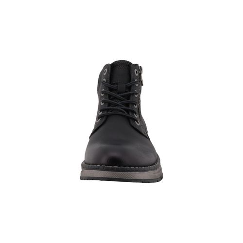 Das synthetische Obermaterial wirkt glatt und pflegeleicht, während die geschlossene Schnürung mit Metallösen sicheren Halt ermöglicht und eine seitliche Reißverschlusslösung das An- und Ausziehen erleichtert. Die gesteppte Rahmennähte und die profilierte Sohle sorgen für Struktur und guten Bodenkontakt, die abgesetzte Kante betont die Konstruktion und den geradlinigen Schnitt.