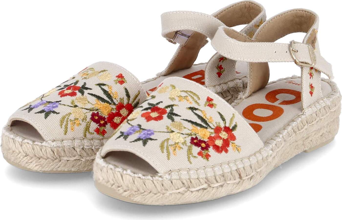 Die beigen Damen-Sandalen GARBET von Toni Pons aus Textil begeistern mit einer farbenfrohen Blumenstickerei, die dem Modell eine verspielte und sommerliche Ausstrahlung verleiht. +