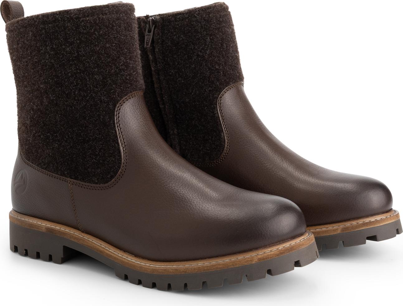 Der Schaft ist an der Außenseite mit Filz versehen, was ihm einen charakteristischen Outdoor-Look verleiht. Das herausnehmbare Fußbett mit Wollauflage bietet zusätzliche Dämpfung und lässt sich bei Bedarf für noch mehr Halt einfach austauschen.