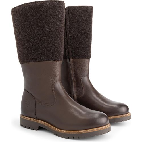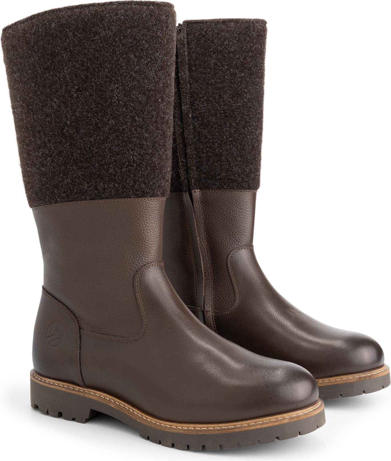 Die Kombination aus wasserabweisendem Vollnarbenleder und einem Filzbesatz verleiht diesem Stiefel eine natürliche, robuste Eleganz. Innen ist der Skive vollständig mit weicher Wolle gefüttert, vom Schaft bis zum herausnehmbaren Fußbett.