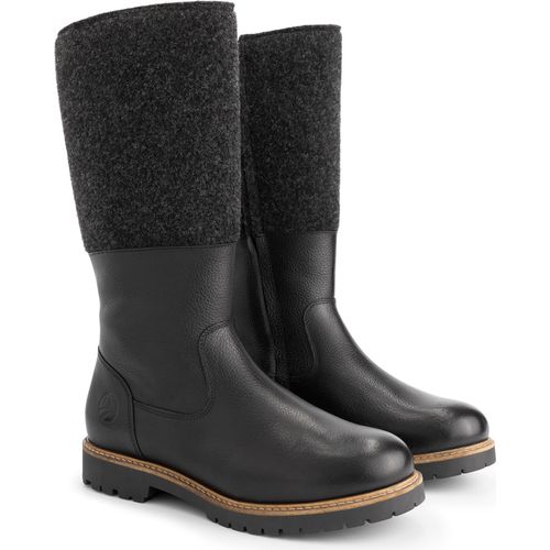 Die Kombination aus wasserabweisendem Vollnarbenleder und einem Filzbesatz verleiht diesem Stiefel eine natürliche, robuste Eleganz. Innen ist der Skive vollständig mit weicher Wolle gefüttert, vom Schaft bis zum herausnehmbaren Fußbett.
