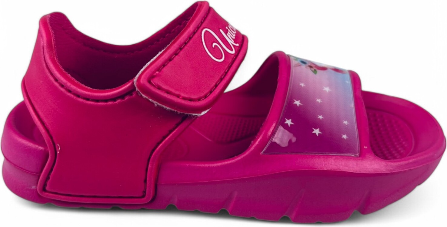 Mit einem süßen Einhorn an den Füßen wird jeder Sommertag magisch!Die pinkfarbenen Badesandalen verzaubern mit einem traumhaften Einhorn-Motiv auf dem Riemen. Dank Klettverschluss sind sie kinderleicht anzuziehen und sitzen sicher.Flexibel, spritzwassergeeignet und leicht profiliert – ideal für zauberhafte Wasserabenteuer!