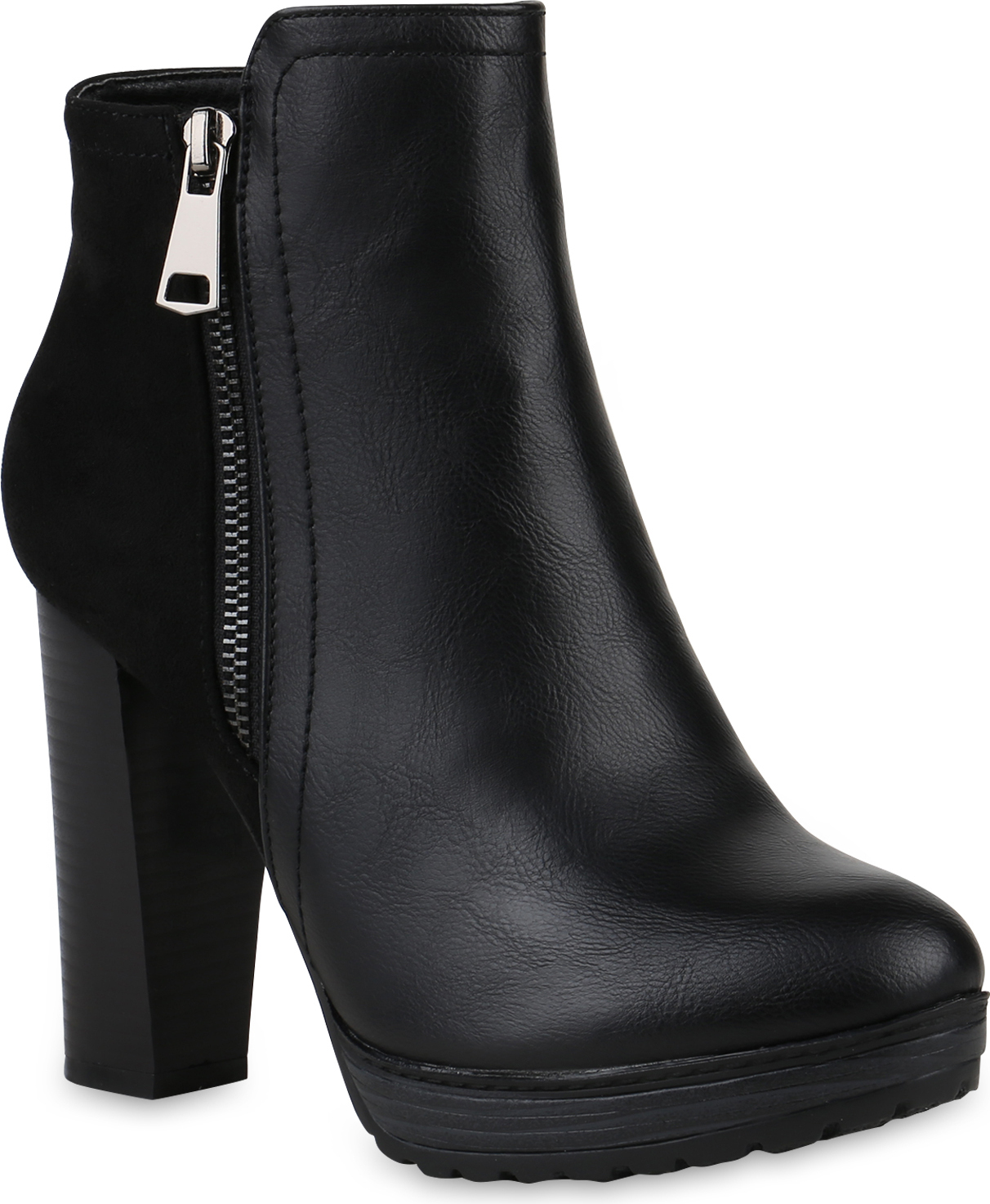 VAN HILL 818507 Plateaustiefelette Damen Stiefeletten Plateau-Boots Zipper Holzoptikabsatz (schwarz)