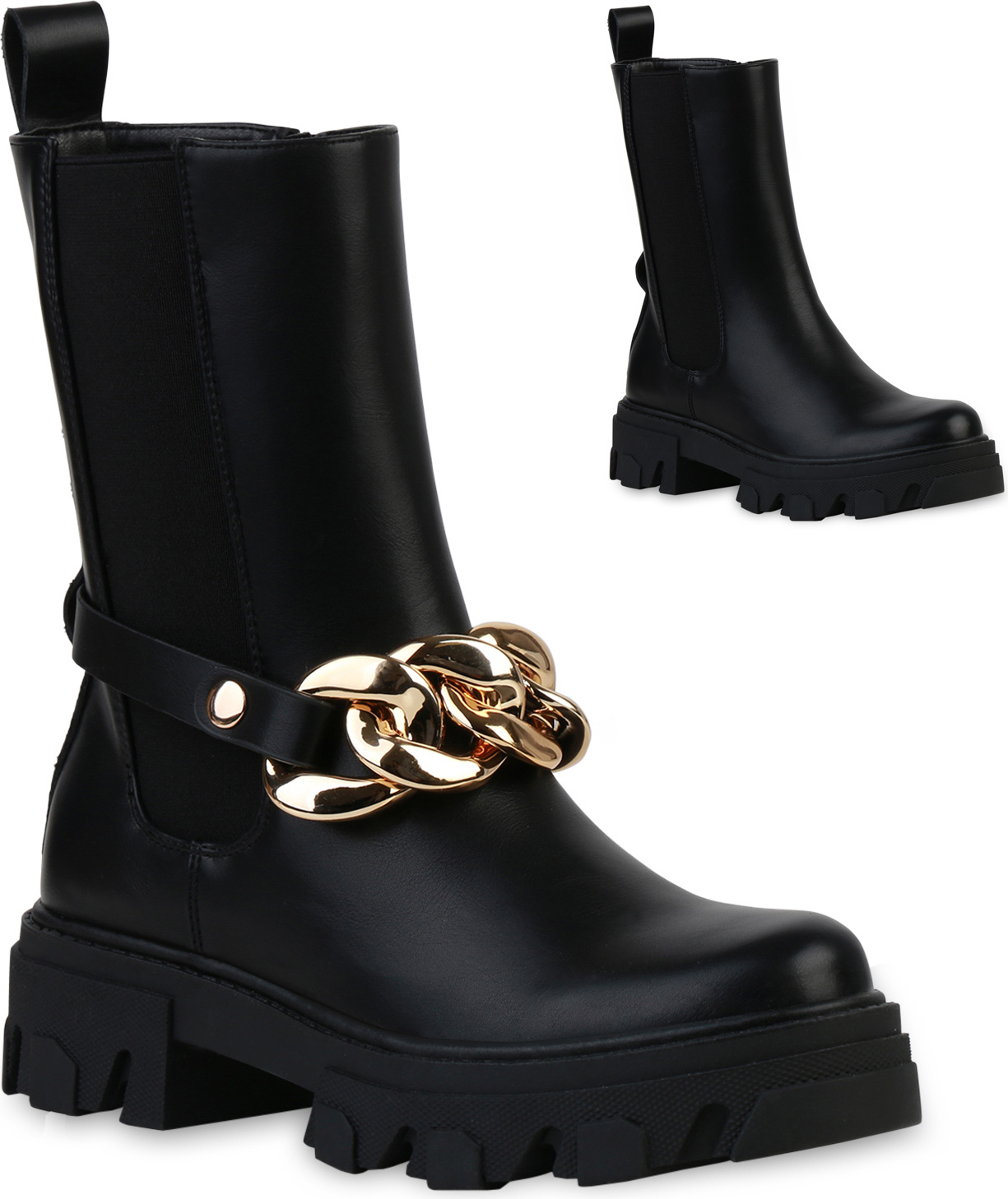 VAN HILL 837633 Plateaustiefelette Damen Plateau Boots Stiefeletten Ketten Stiefel Profil-Sohle (schwarz)