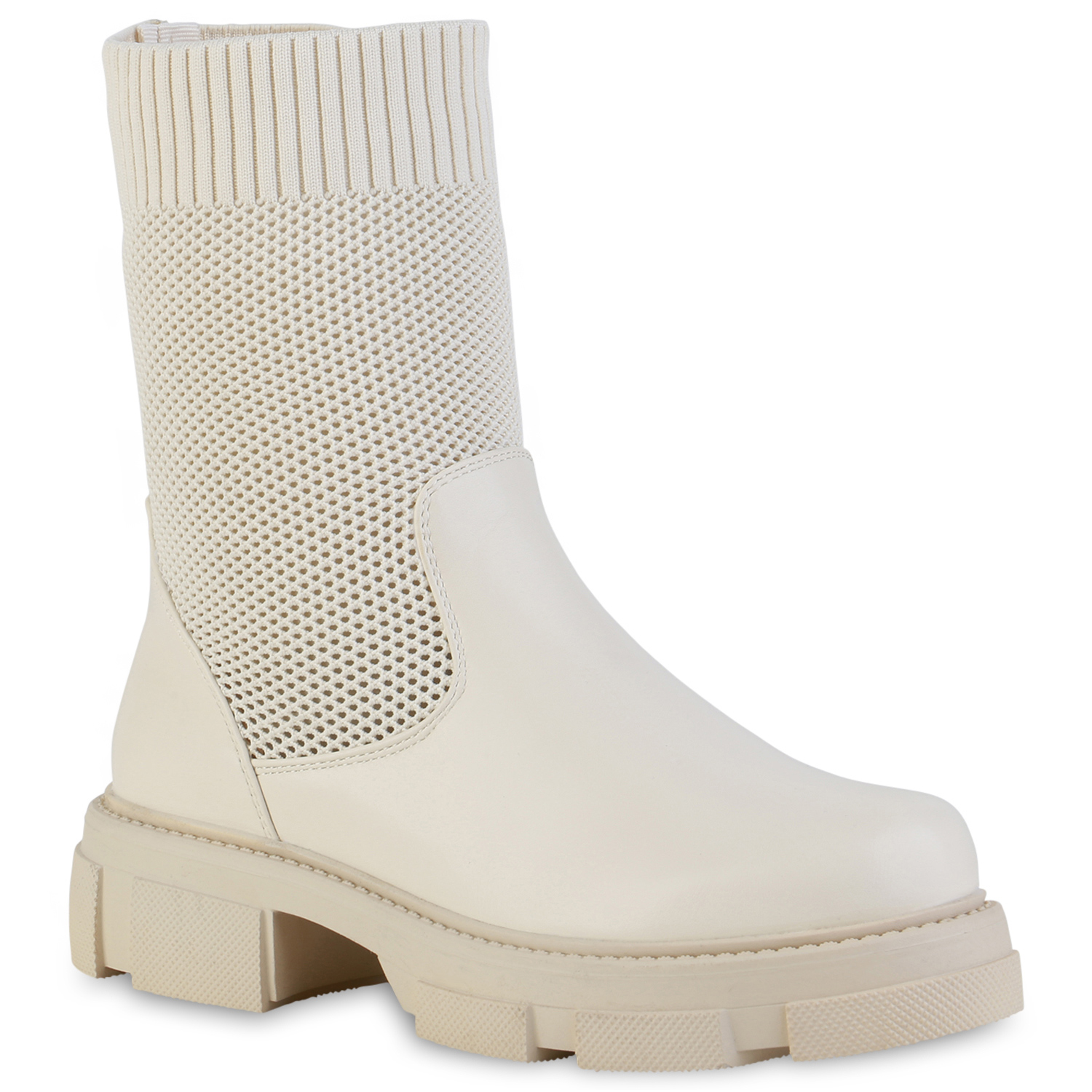 VAN HILL Damen Stiefeletten Schlupfstiefeletten Strick Profil-Sohle Schuhe 838340, Farbe: Beige, Größe: 38