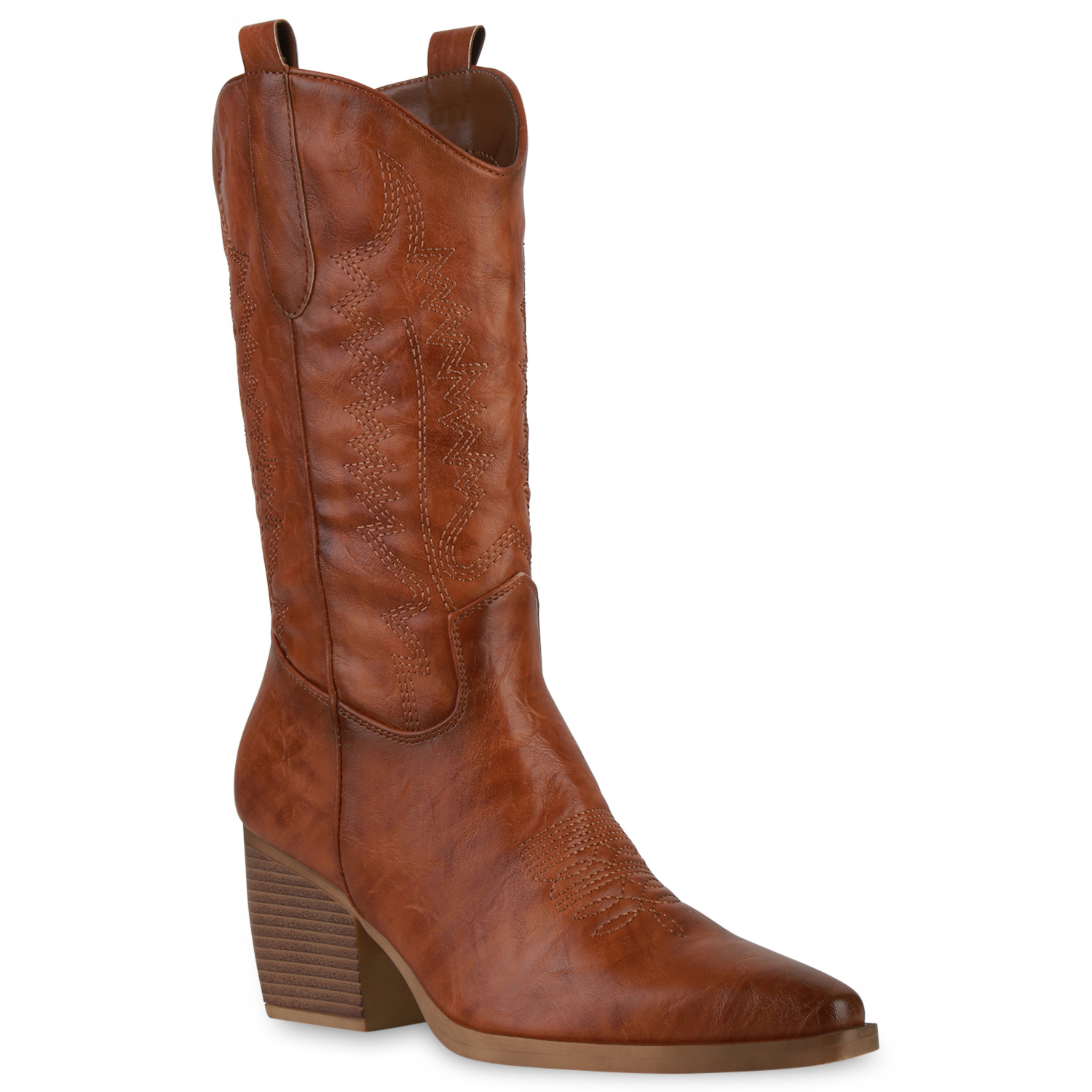 VAN HILL 838384 Cowboystiefel Damen Stiefel Cowboystiefel Holzoptikabsatz Stickereien (braun)