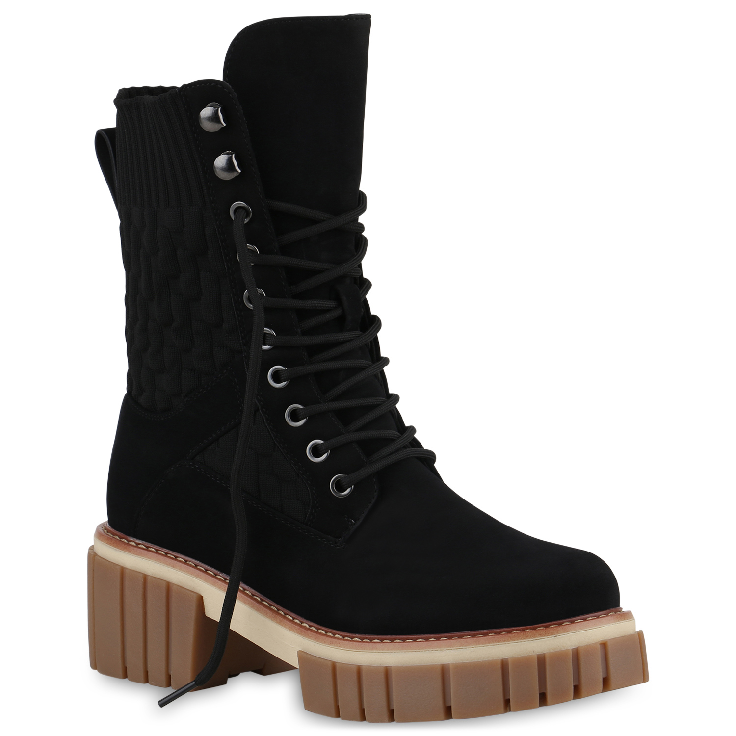 VAN HILL 839707 Plateaustiefelette Damen Leicht Gefütterte Plateau Boots Stiefeletten Strick (schwarz)