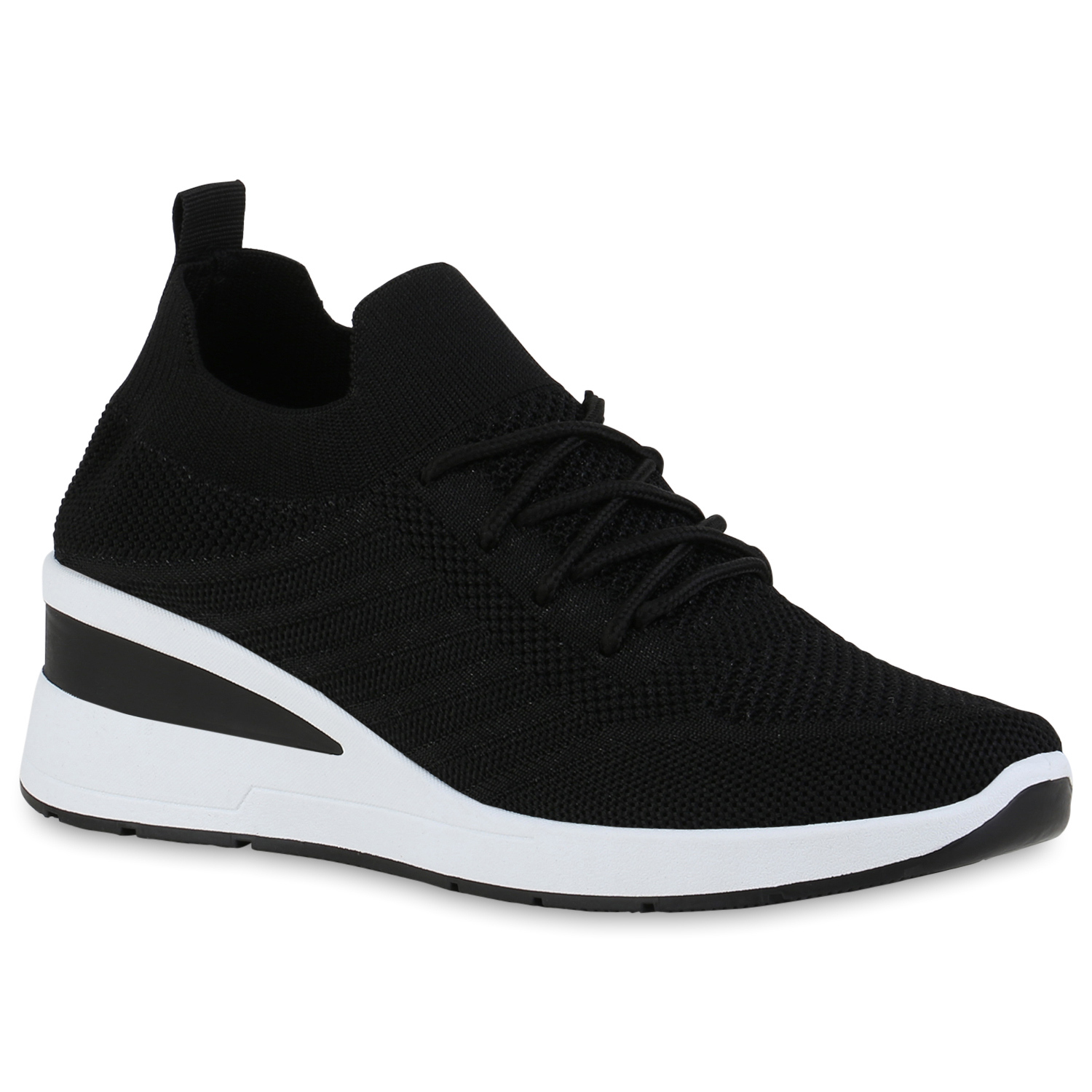 VAN HILL 840166 Wedgesneaker Damen Sneaker Wedges Schnürer Strick Profil-Sohle (schwarz)