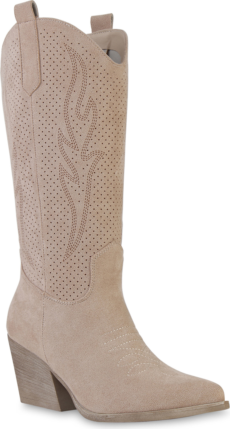 VAN HILL 840199 Cowboystiefel Damen Cowboystiefel Stiefel Stickereien Holzoptikabsatz (beige)