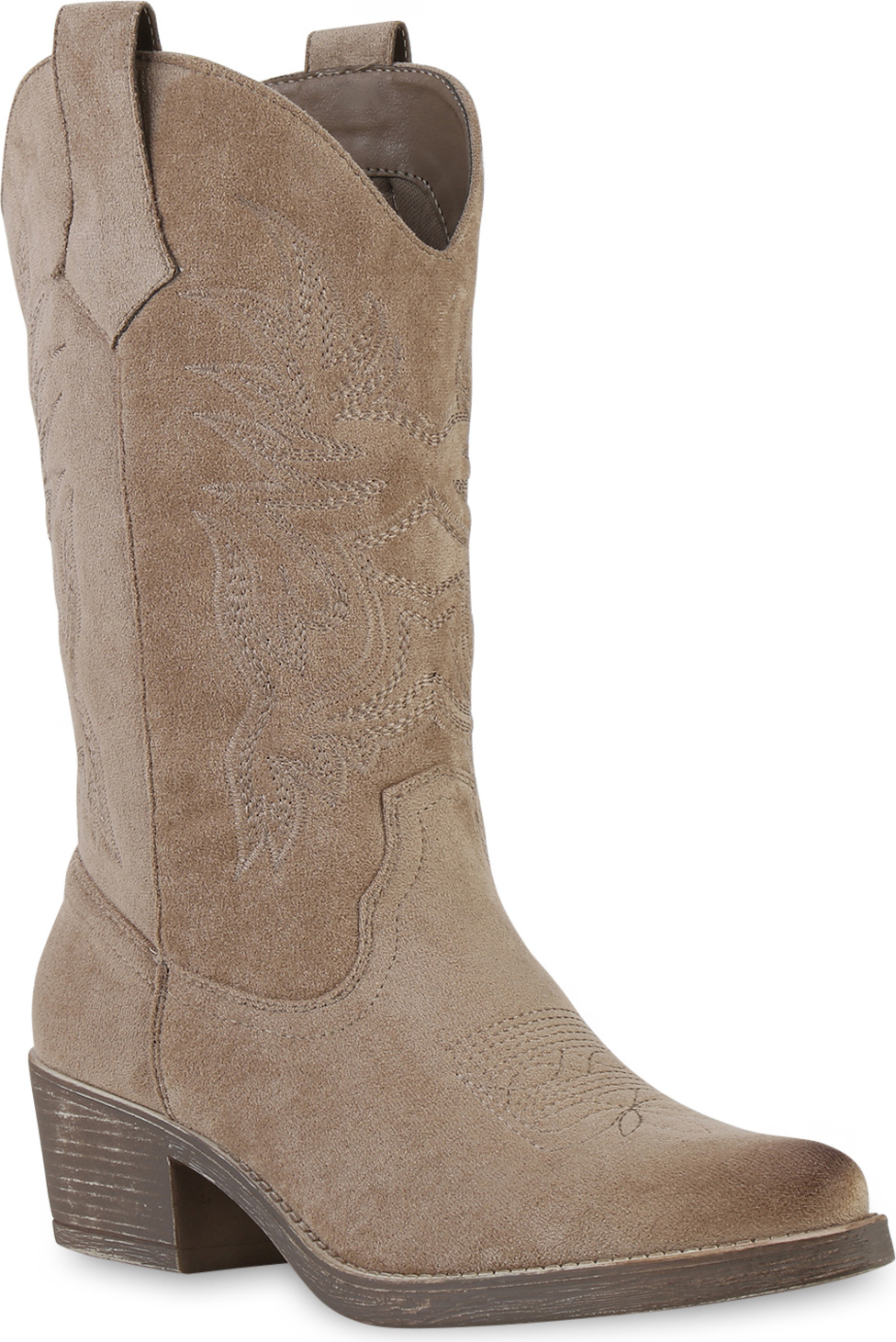 VAN HILL 840336 Cowboystiefel Damen Cowboystiefel Stiefel Stickereien Holzoptikabsatz (braun)