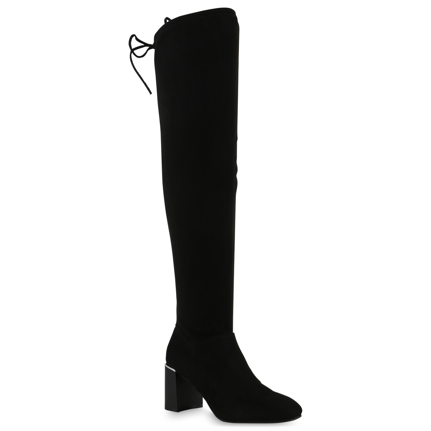 VAN HILL 840522 Overkneestiefel Damen Overknees Stiefel Holzoptikabsatz Langschaftstiefel (schwarz)