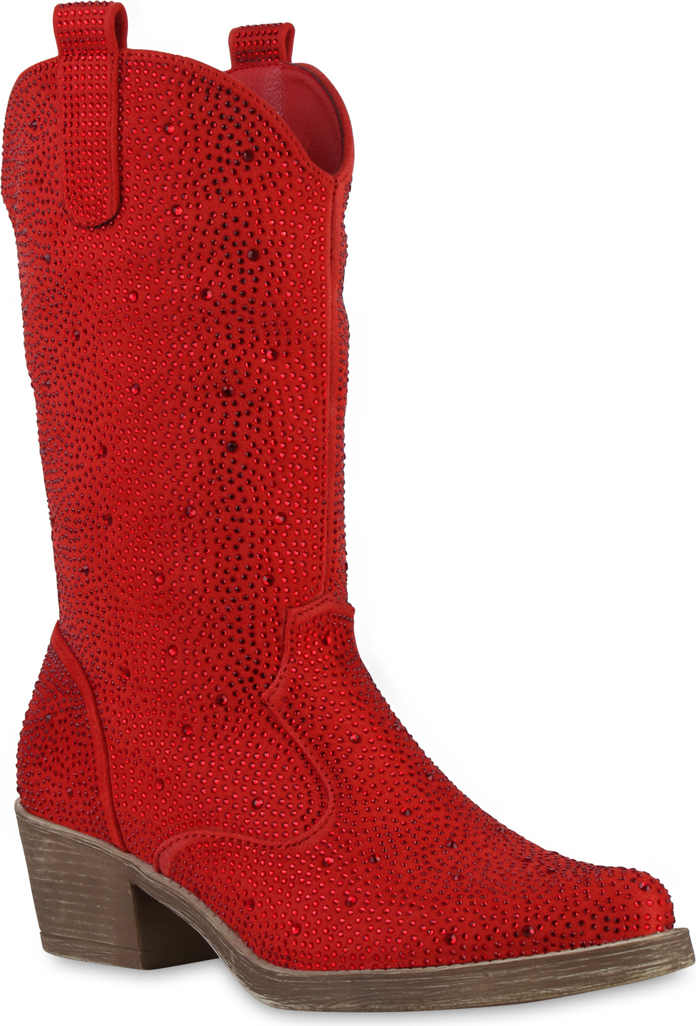 VAN HILL 840905 Cowboystiefel Damen Cowboystiefel Stiefel Spitze Strass Western (rot)