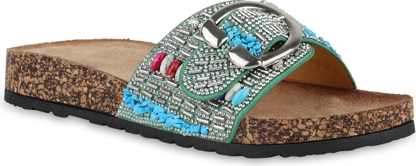 VAN HILL 840988 Pantolette Damen Pantoletten Sandalen Strass Zierperlen Schnallen (grün)