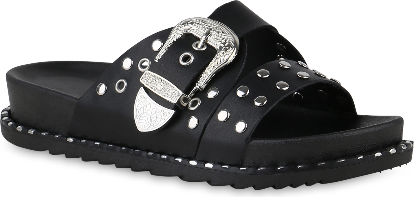 VAN HILL 840995 Pantolette Damen Pantoletten Sandalen Nieten Schnallen Profil-Sohle (schwarz)