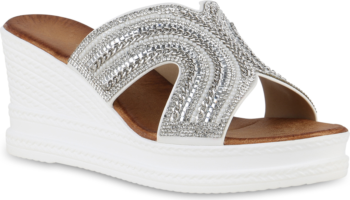VAN HILL 840997 Sandalette Damen Pantoletten Sandaletten Strass Ketten Plateau Vorne (weiß)