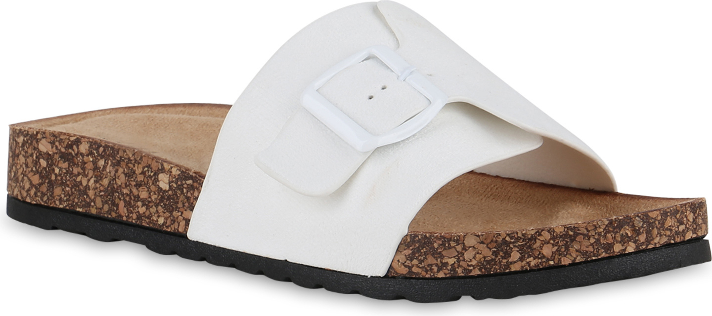 VAN HILL 841089 Pantolette Damen Pantoletten Sandalen Schnallen Korkoptik Profil-Sohle (weiß)