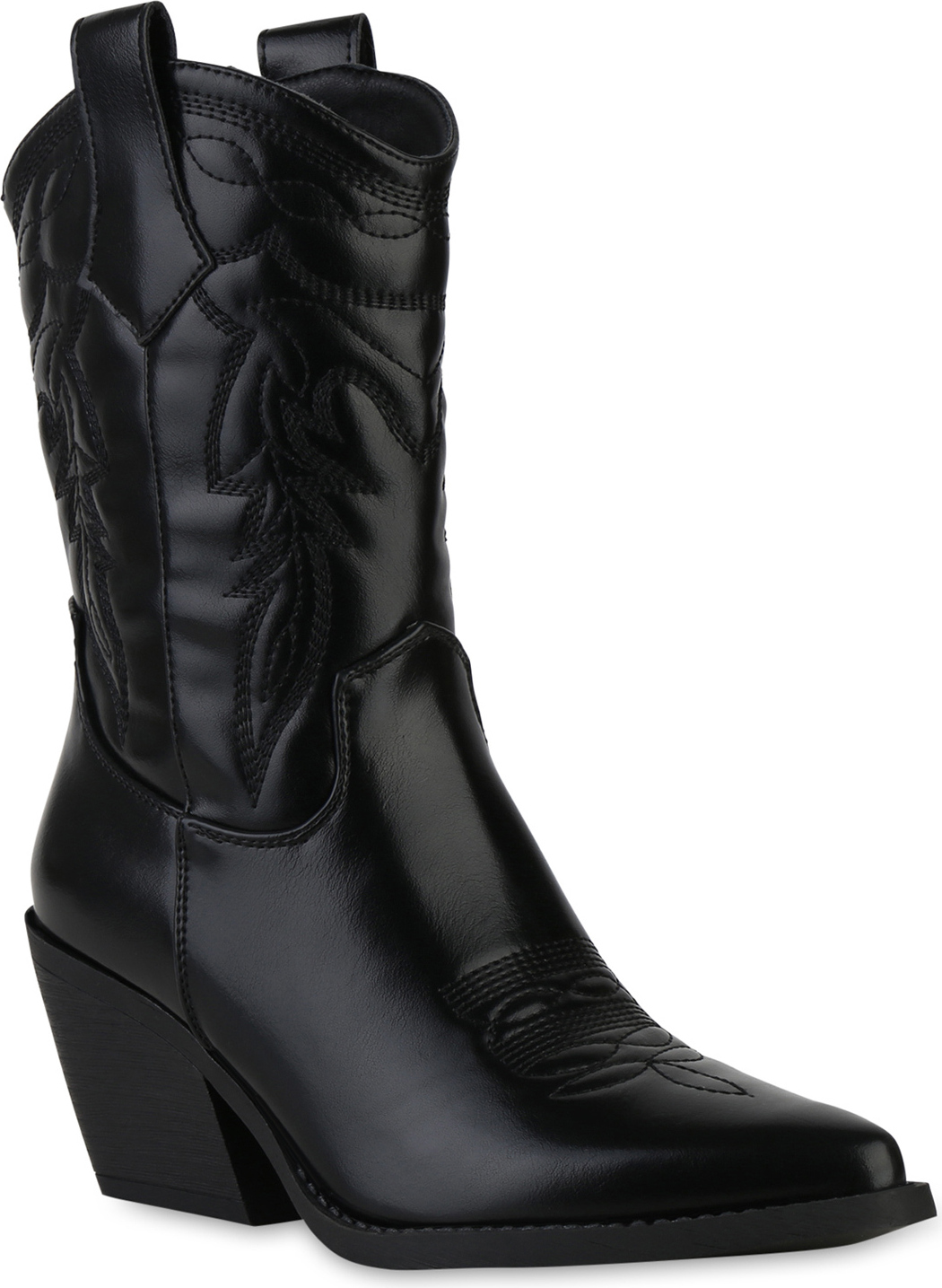 VAN HILL 841116 Cowboystiefel Damen Cowboystiefel Stiefel Spitz Zierperlen Holzoptikabsatz Schuh (schwarz)