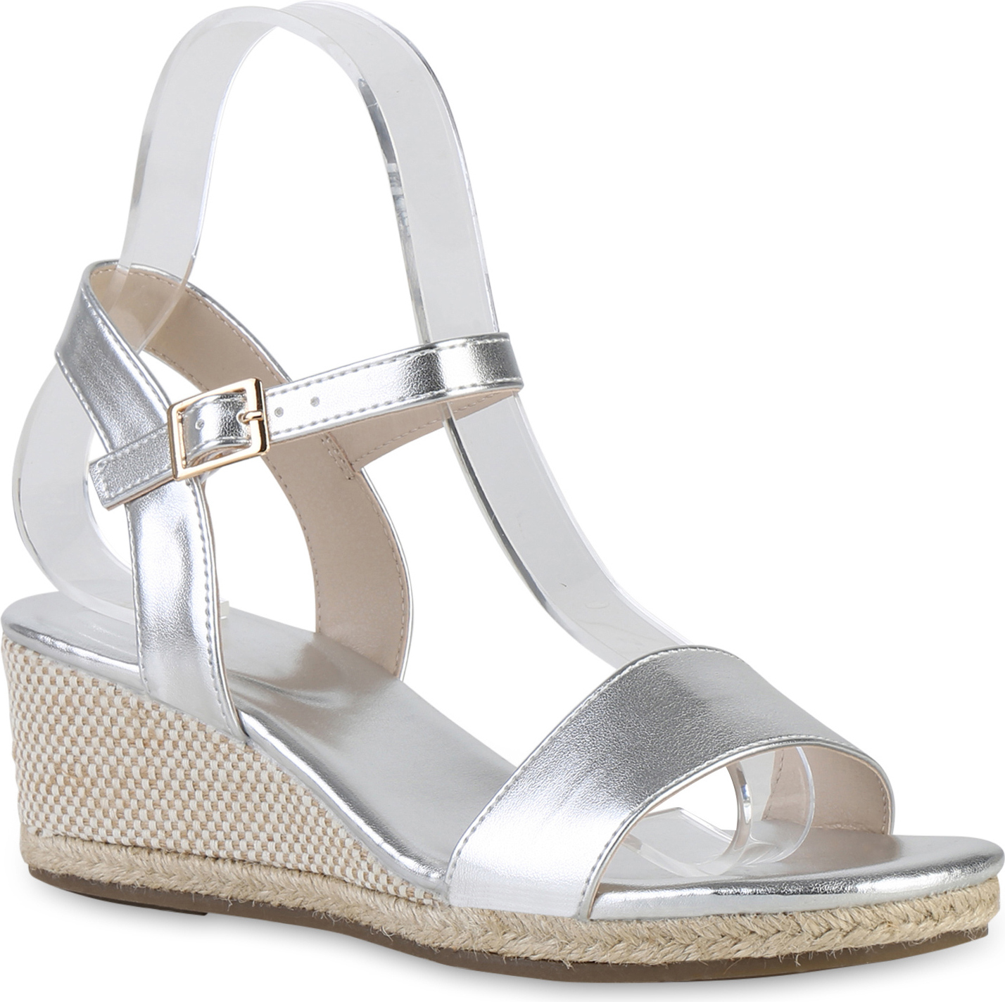 VAN HILL 841128 Keilsandalette Damen Keilsandaletten Sandaletten Bast Freizeit Sommer (silber)