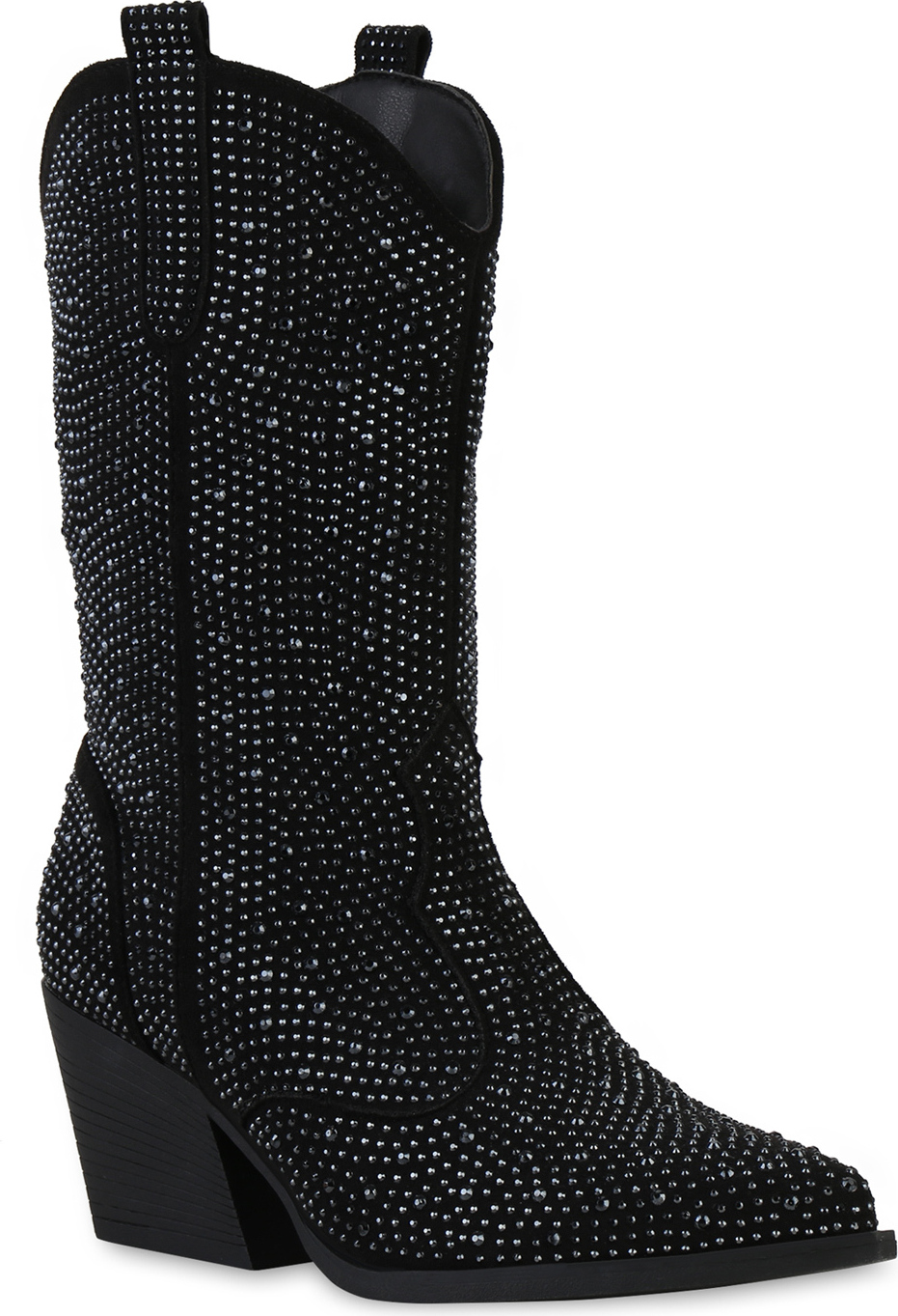 VAN HILL 841327 Cowboystiefel Damen Leicht Gefütterte Cowboystiefel Stiefel Spitze Strass (schwarz)