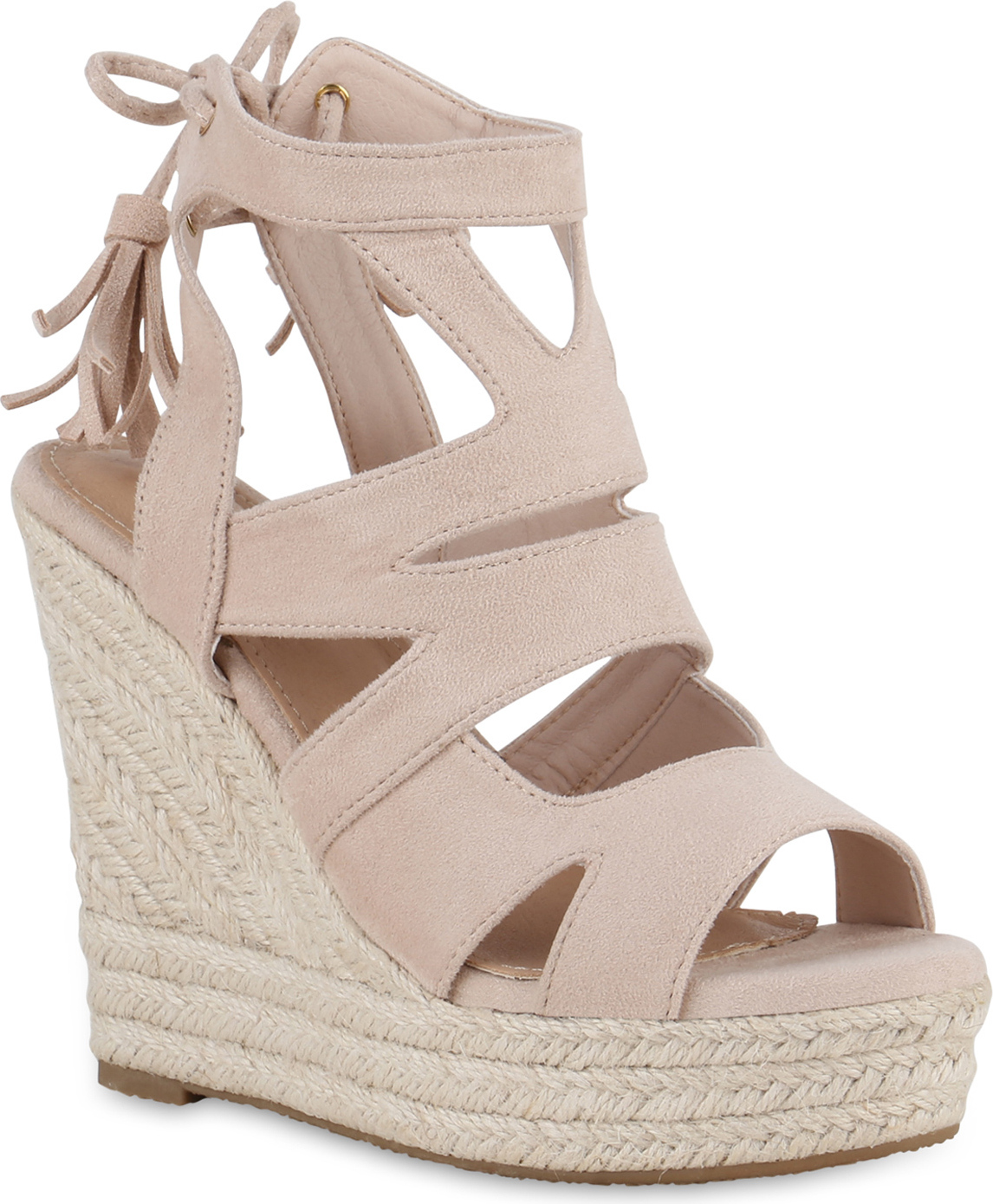VAN HILL 841372 Keilsandalette Damen Keilsandaletten Sandaletten Bast Quasten Cut-Outs (beige)