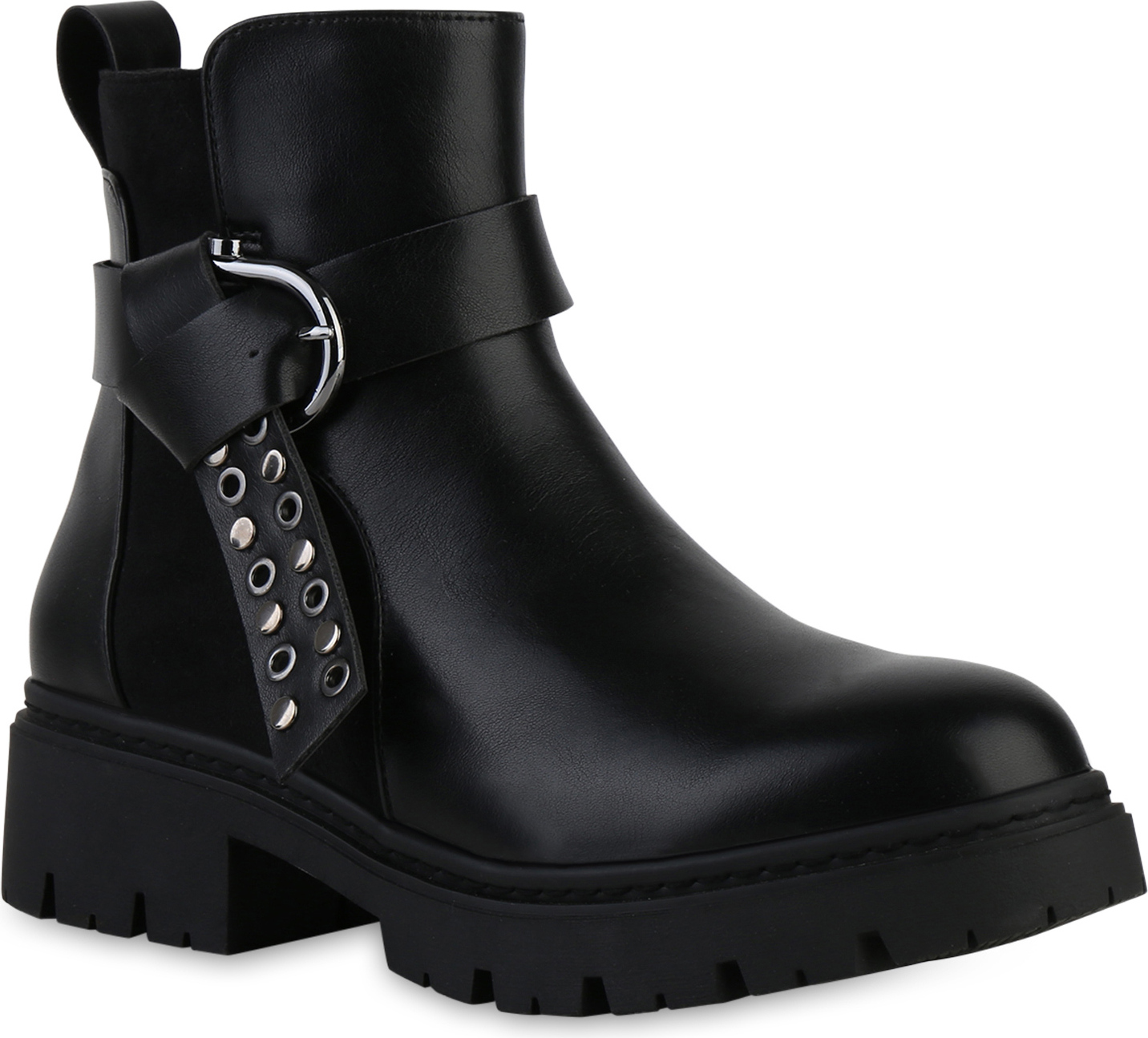 VAN HILL 841474 Bikerboots Damen Biker Boots Stiefeletten Schnallen Ösen Nieten (schwarz)