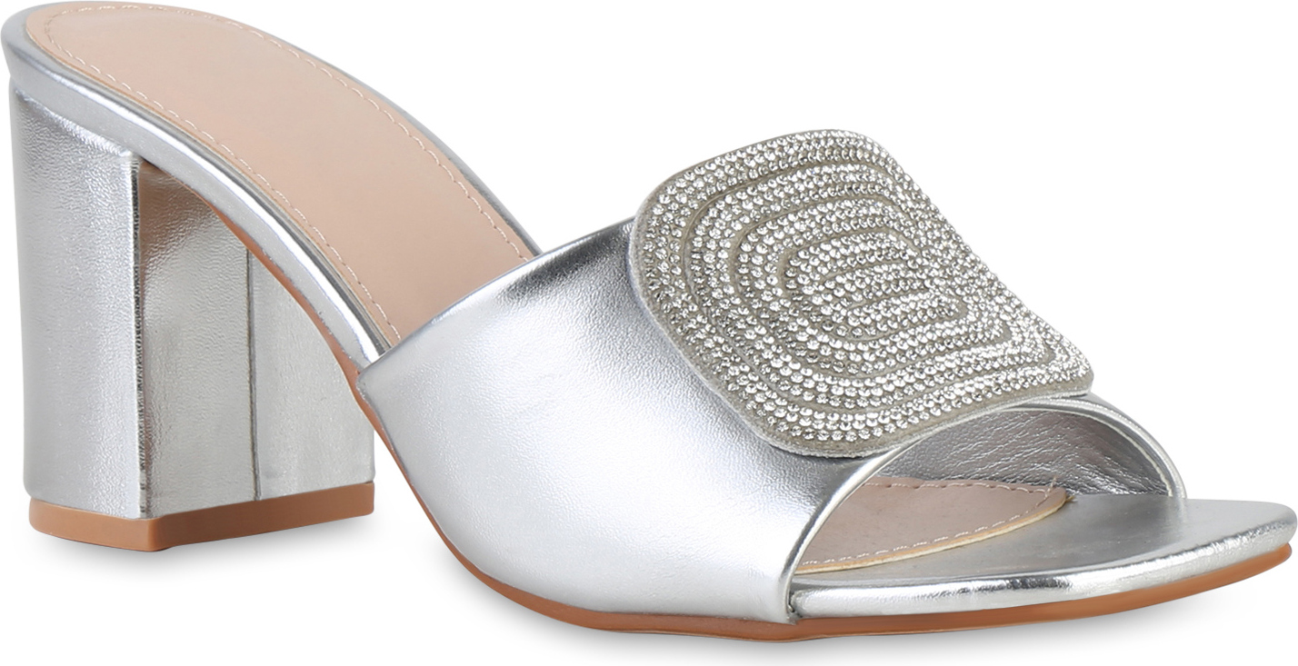 VAN HILL 841538 Sandalette Damen Pantoletten Sandaletten Strass Leder-Optik Absatz- (silber)