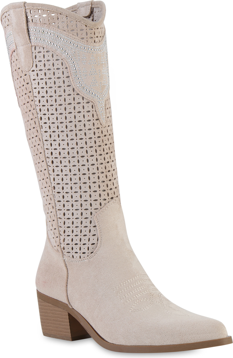 VAN HILL 841580 Cowboystiefel Damen Cowboystiefel Stiefel Spitze Cut-Outs Holzoptikabsatz (beige)