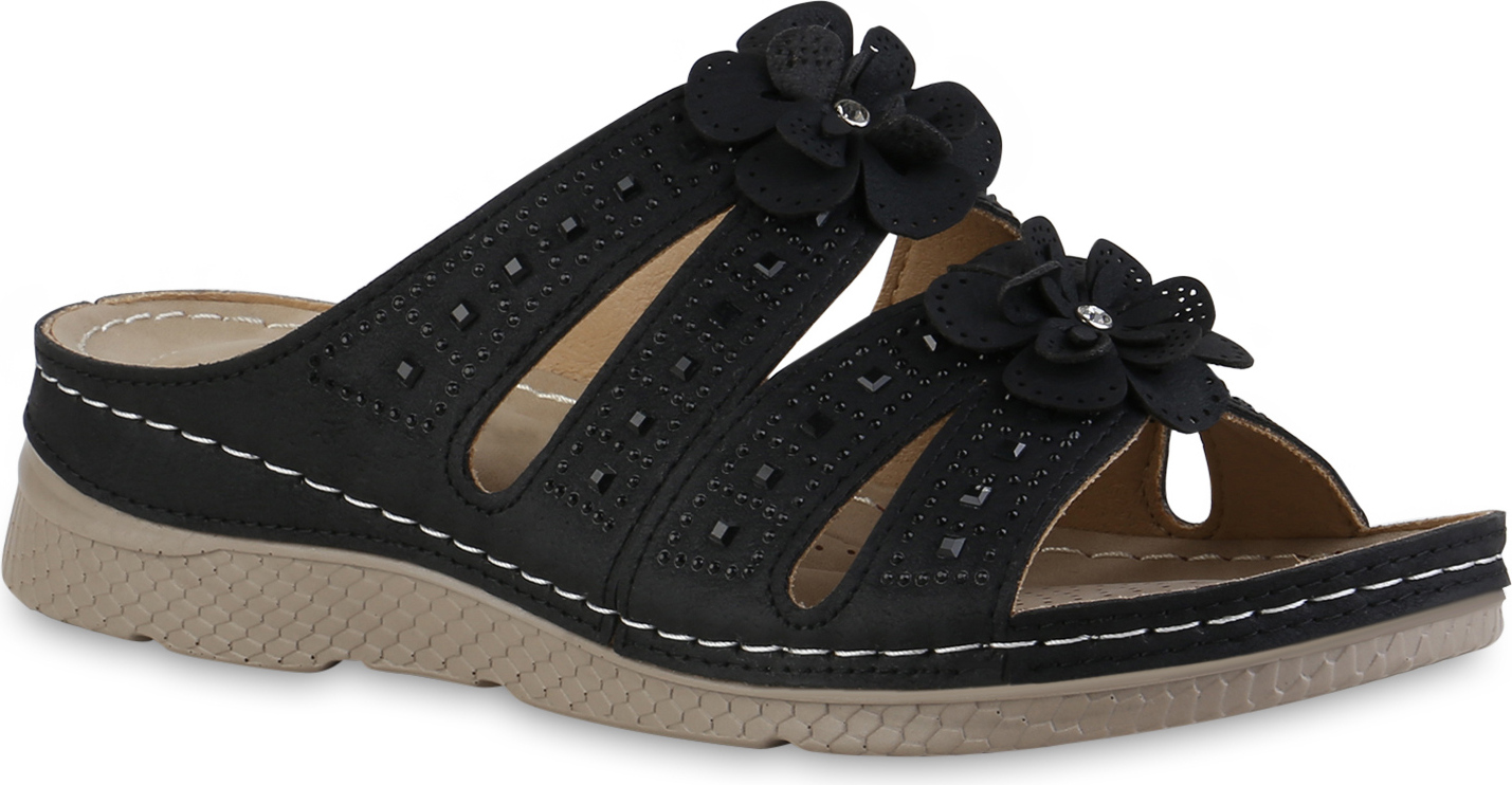 VAN HILL 841606 Sandale Damen Komfort Sandalen Bequeme Blumen Strass Cut-Outs (schwarz)