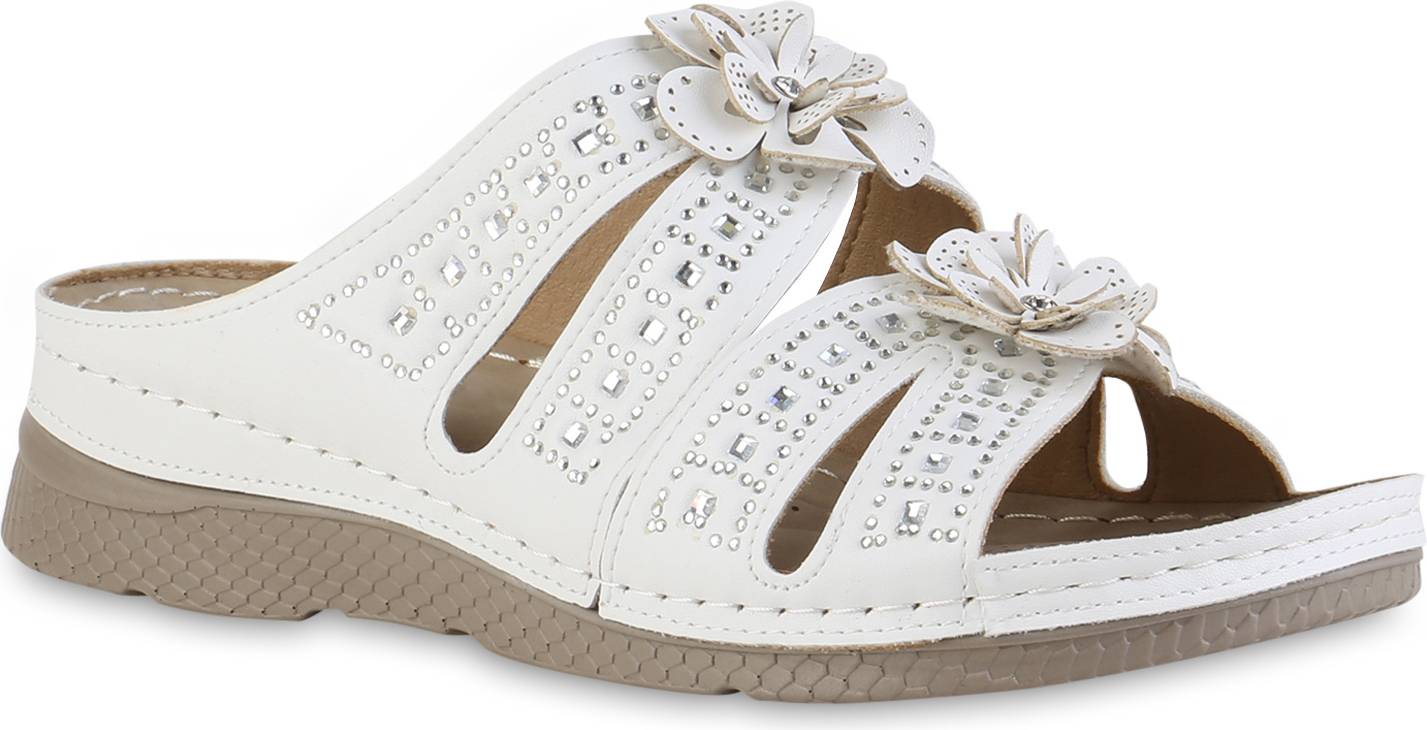 VAN HILL 841606 Sandale Damen Komfort Sandalen Bequeme Blumen Strass Cut-Outs (weiß)