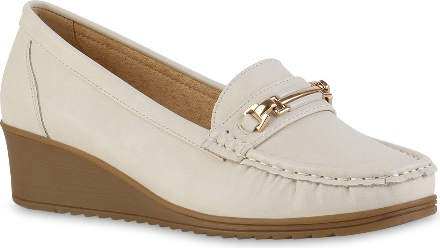 VAN HILL 841622 Slipper Damen Keilslippers Slippers Profil-Sohle Leder-Optik (beige)