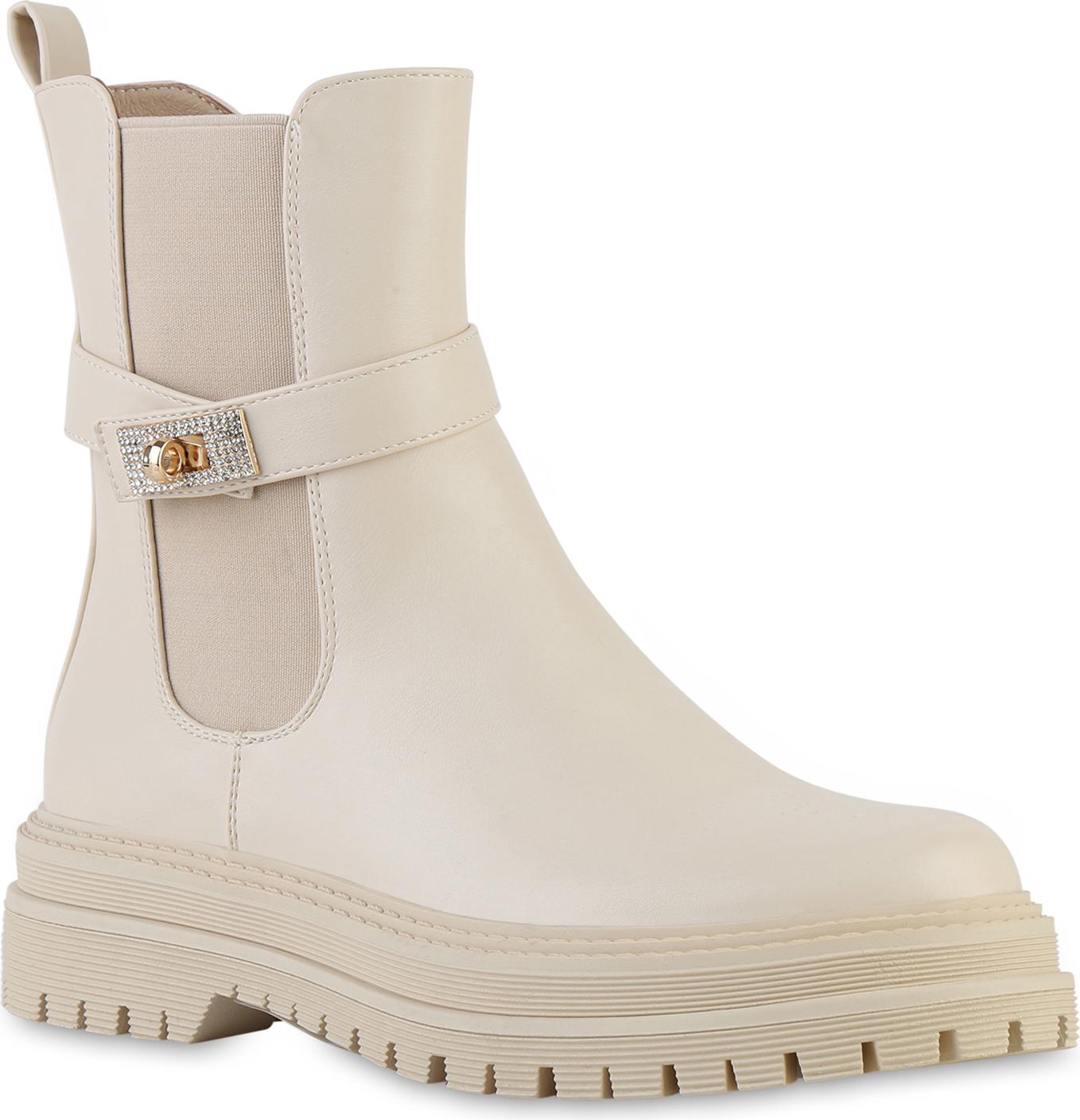 VAN HILL 841822 Bikerboots Damen Leicht Gefütterte Biker Boots Stiefeletten Schnallen (beige)