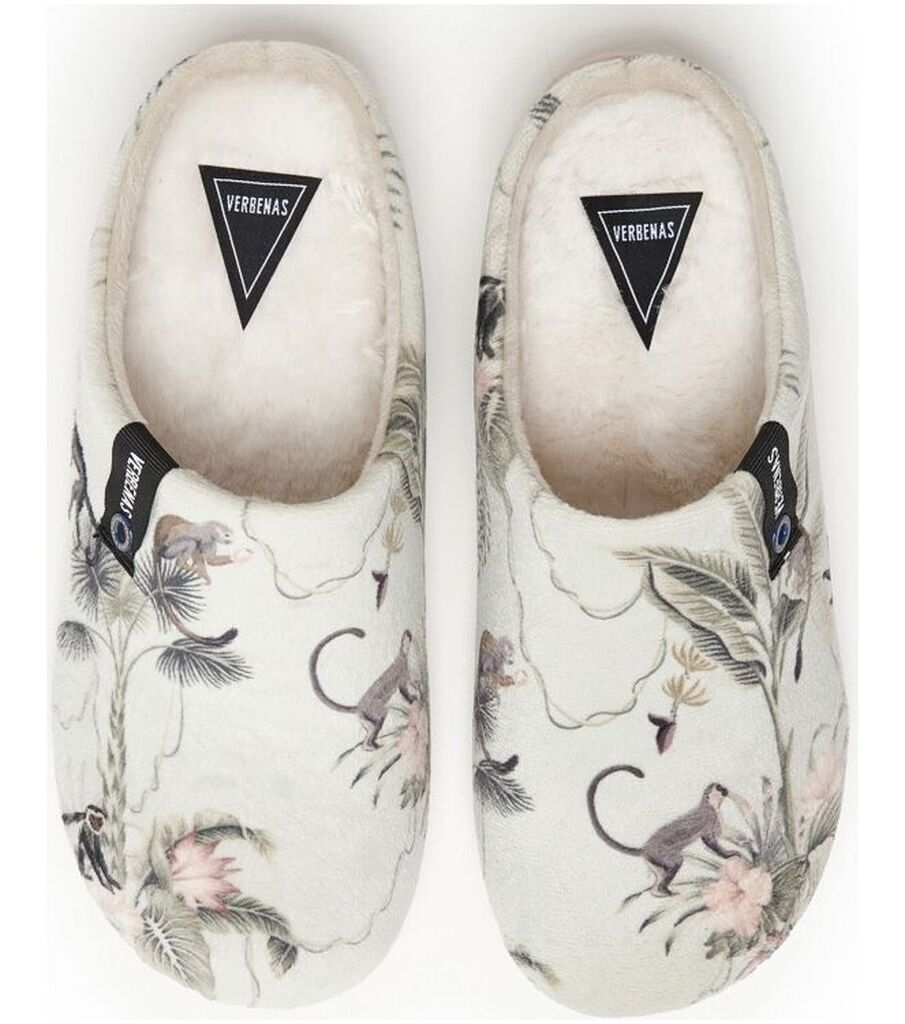 Der Hausschuh York Jungle Monkie für Damen kommt aus dem Hause Verbenas und überzeugt mit seinem außergewöhnlichen Design in Beige mit einem hübschen Dschungel Print.Das weiche Textil Obermaterial hält die Füße auch im Winter warm und die Gummisohle bietet gleichzeitig einen sicheren Halt. +