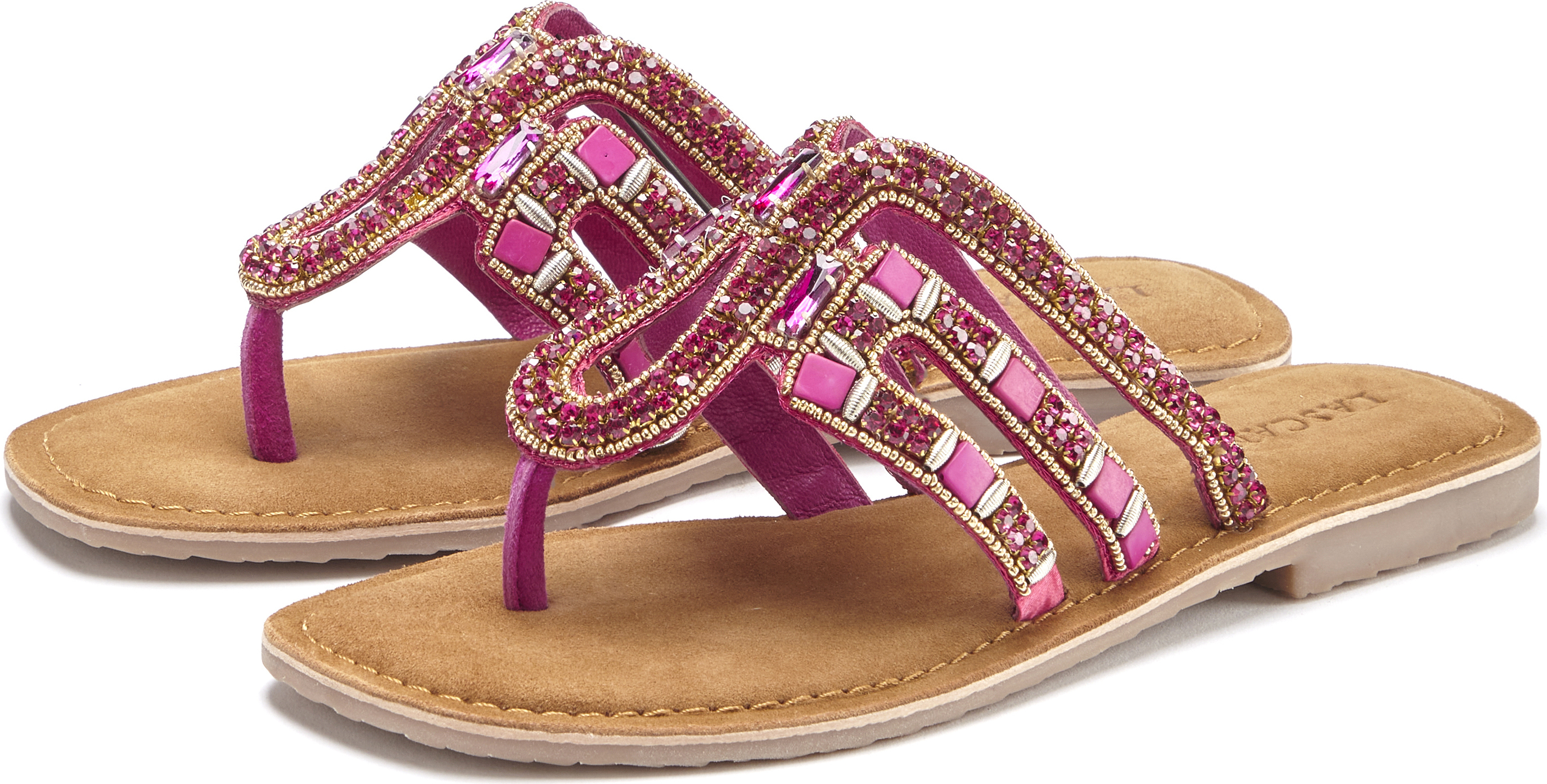 Das Obermaterial aus Ziegenleder ist nämlich märchenhaft mit glitzernden Schmucksteinen verziert. Ein Design, das jedem Sommer- und Urlaubs-Look Glanz und Glamour verleiht.