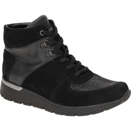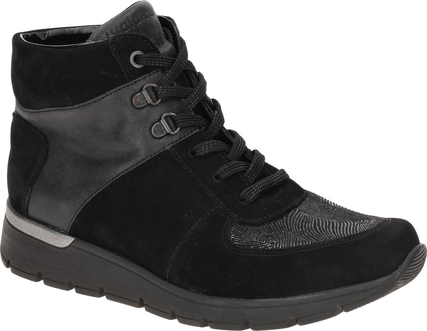 Marke: WaldläuferModell-Nr.: 626K82 304 001Modellname: K-RAMONAArt: Damen Stiefeletten - bequeme StiefeletteFarbe: schwarz +, fiedrig glänzenjd gemustert +, dunkelgrau (schwarz)Obermaterial: Nubuck Leder +, Textil (Denver, Turbostretch, Bronx)Innenfutter: Textil - weich gepolstert, 100% Polyester - dünn gefüttert, Stretch im Hallux-BereichInnensohle: Textil FußbettWechselfußbett: herausnehmbare InnensohleLaufsohle: PU (Polyurethan) - extra leicht, LuftpolstersohleVerschluss: Schnürung und ReißverschlussAbsatz: flach - kein Absatz, Keil ca. +