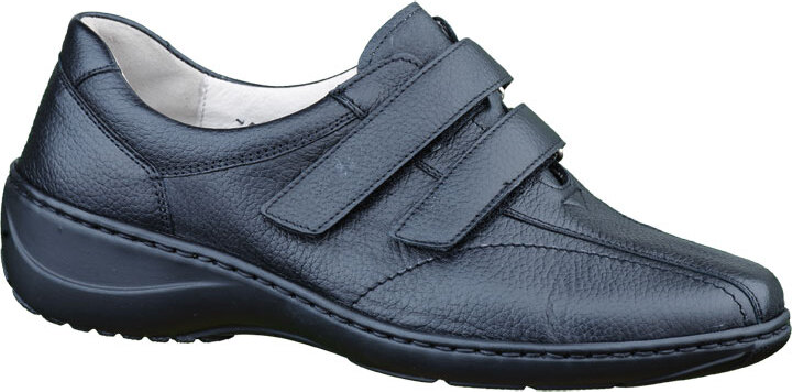 Obermaterial aus weichem Glattleder in der Farbe schwarz. Die praktischen Klettverschlüsse ermöglichen Ihnen ein schnelles An- und Ausziehen und eine Regulierung in der Weite auf dem Spann.