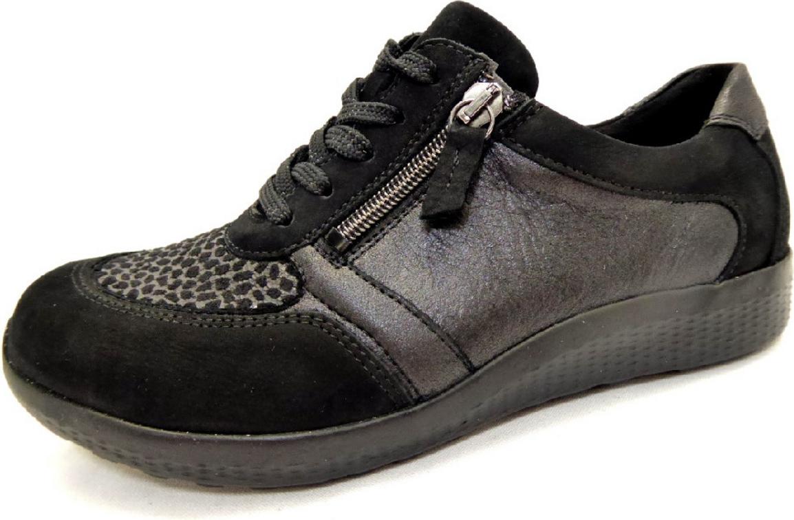 Marke: WaldläuferModell-Nr.: 815M01 312 001Modellname: M-IRAArt: Damenschuhe - bequeme Slipper - Halbschuhe, Waldläufer - OrthoTrittFarbe: schwarz +, Giraffen-Muster (schwarz)Obermaterial: Echtleder - Nubuk +, Glattleder (Denver, Bronx, Giraffestr.-Textil)Innenfutter: Textil - weich gepolstert, Stretch im Hallux-BereichInnensohle: Textil Komfort Fußbett, recycelte MaterialienWechselfußbett: herausnehmbare InnensohleLaufsohle: EVA (Ethylenvinylacetat) - leicht und widerstandsfähig, LuftpolstersohleVerschluss: Schnürung und ReißverschlussAbsatz: Keilabsatz / Wedge, Keil ca. +