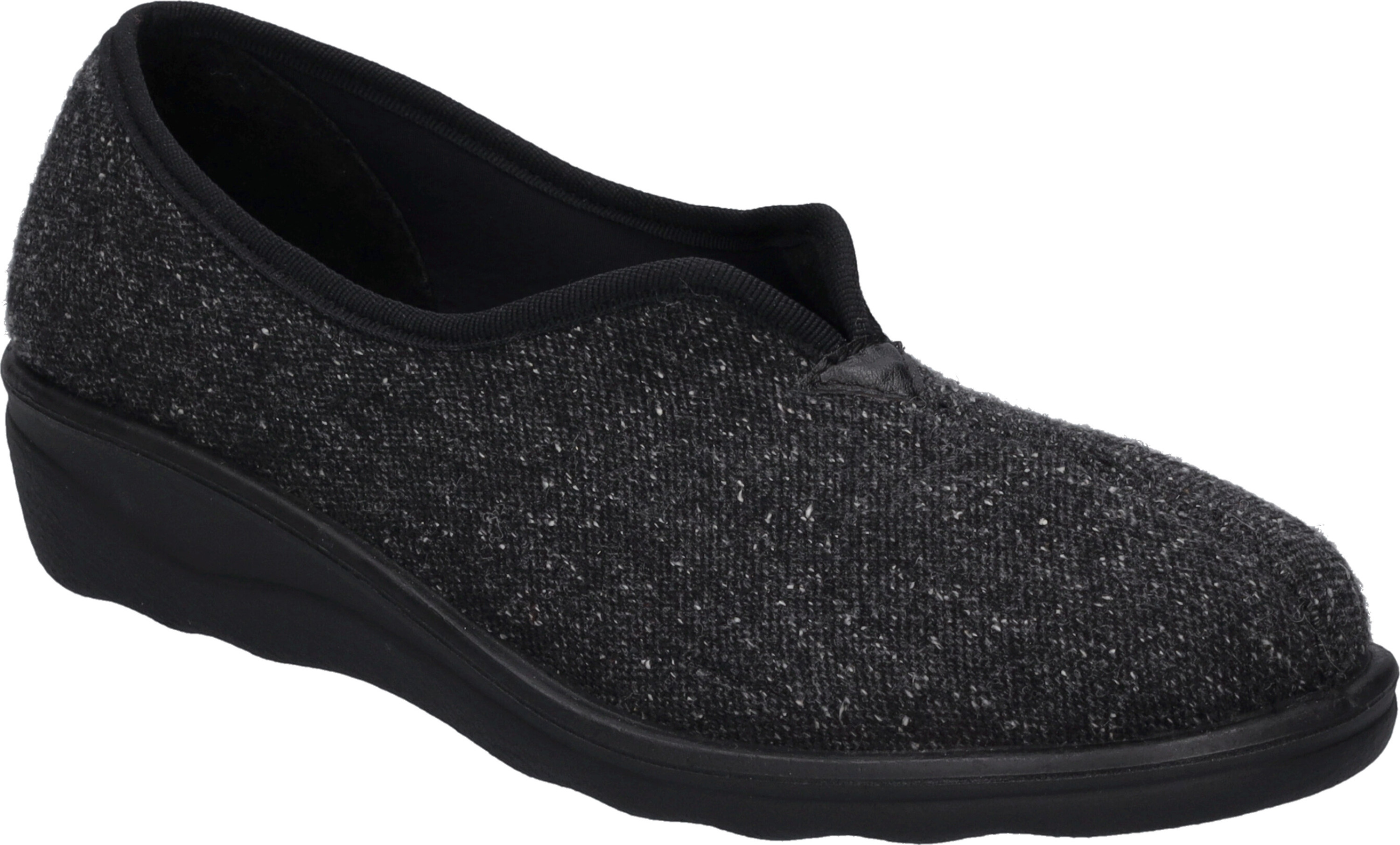 Diesen schwarzen Hausschuh fertigen wir für Dich aus pflegeleichtem Textil. +